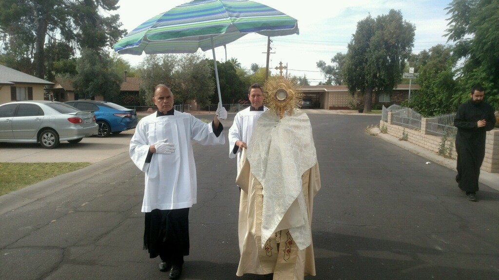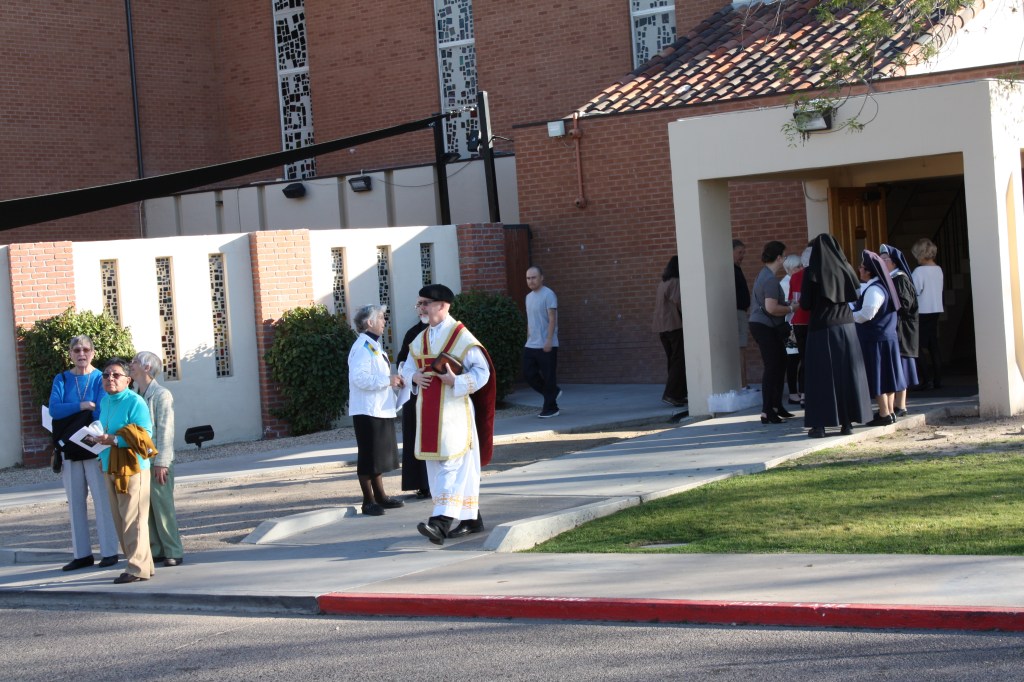 One of the most memorable gifts we received was a surprise visit from the Lord Jesus at the front door of our Convent Who gave us His blessing the Saturday morning before Divine Mercy Sunday. How is this possible, you may ask? Our Pastor and Rector of the Cathedral, Fr. John Lankeit, came bearing a beautiful monstrance with the Blessed Sacrament, and he blessed us as he does for Benediction in the Church. He was walking through the streets in the Cathedral boundaries, accompanied by Deacon Tony Smith and others, blessing the neighborhoods, going from home to home blessing people and families. When I opened the door, all three of us immediately knelt down, reverenced Our Lord, blessed ourselves and were totally humbled that He would come to us. Others were profoundly moved as well and showed their honor by prostrating themselves and kneeling in awe before the Lord in the Eucharist. Later, I saw a man that had been visited by Our Lord; he asked me, “Who was that gentleman that came here?”