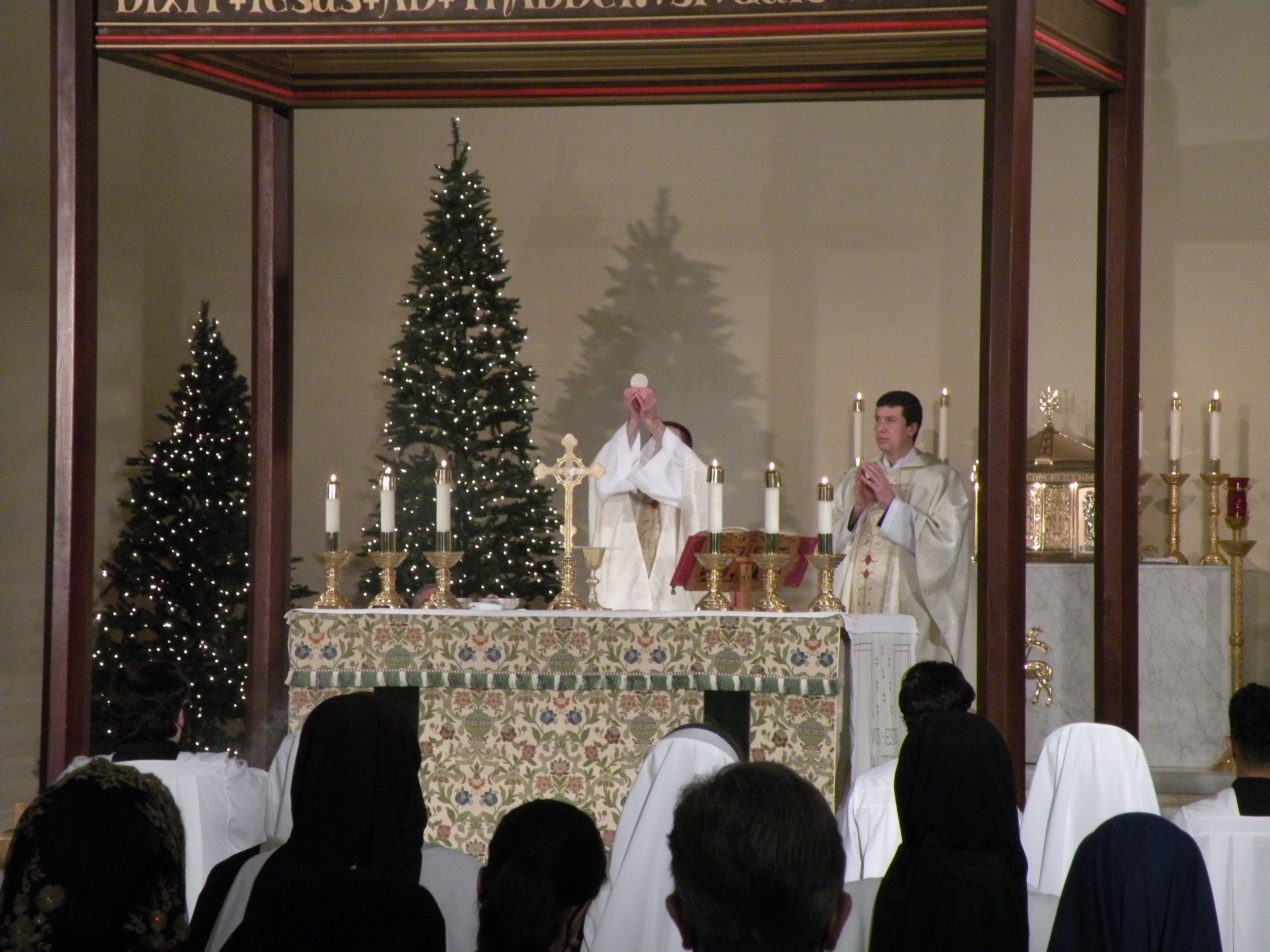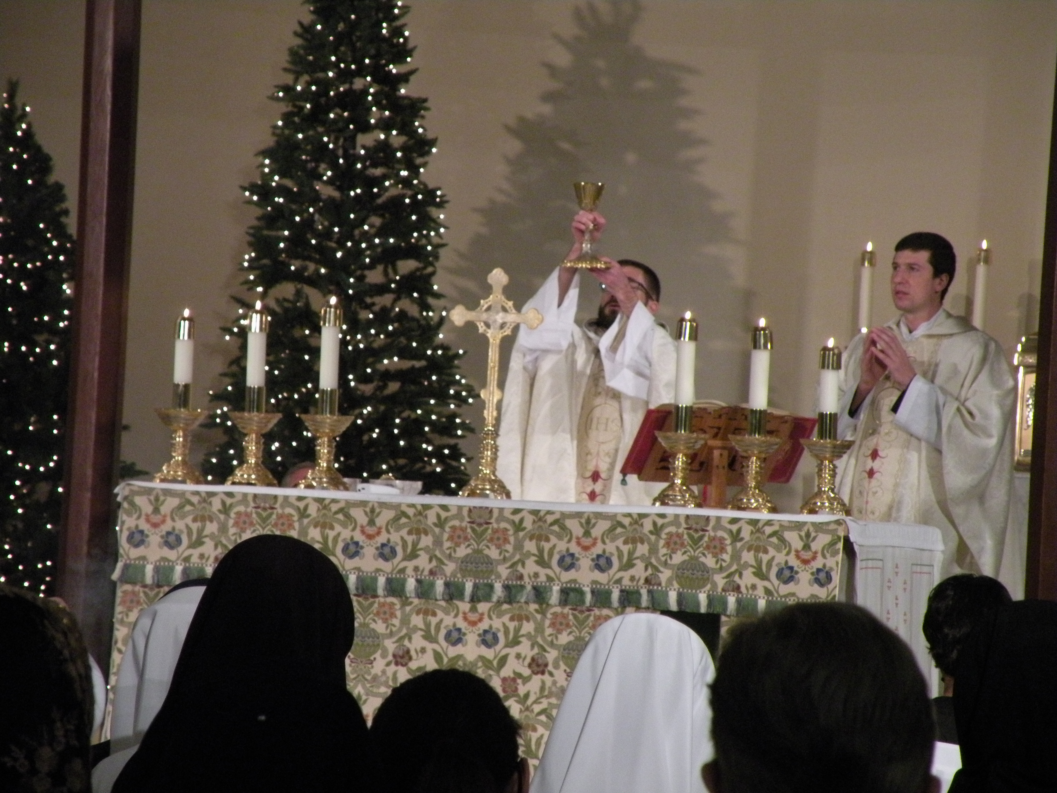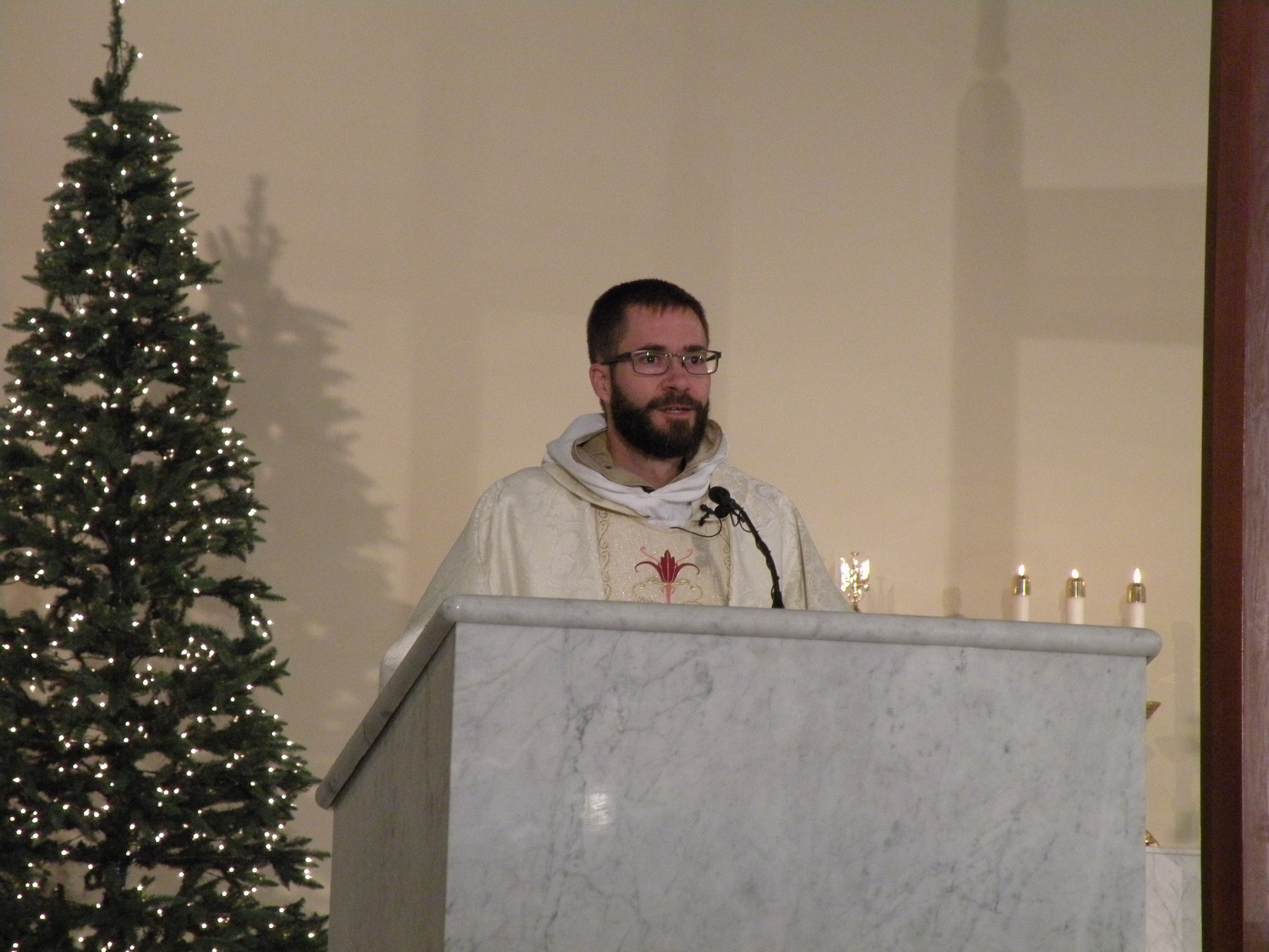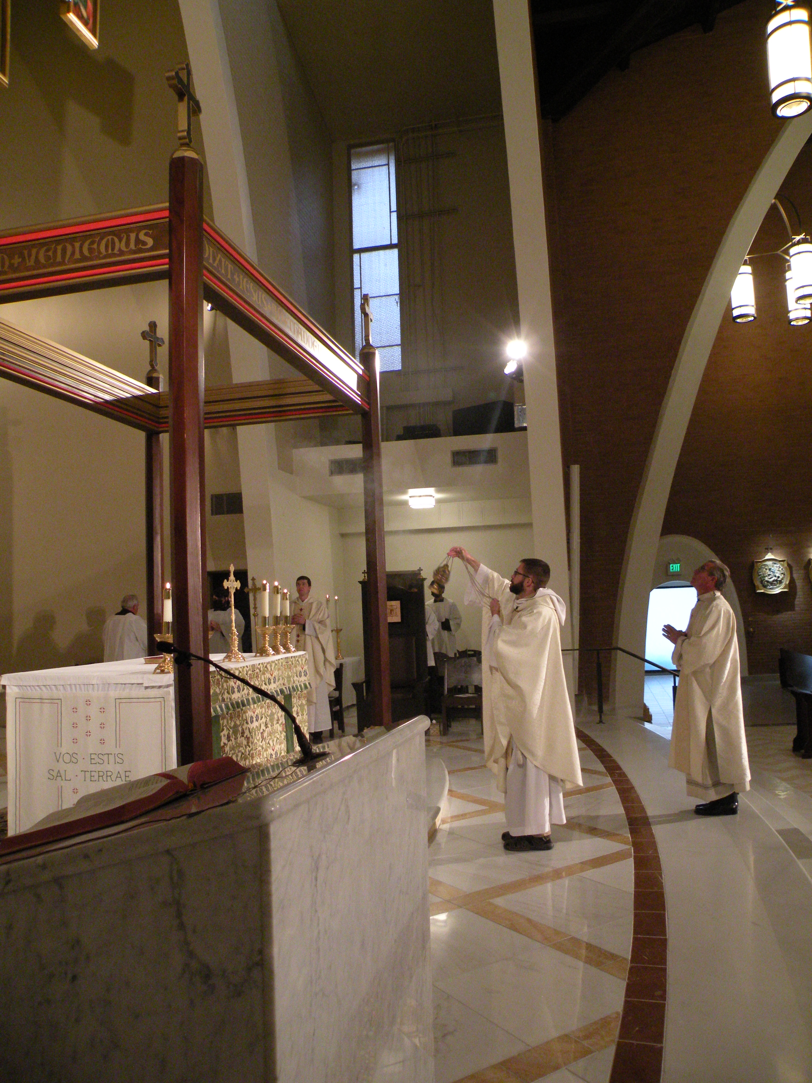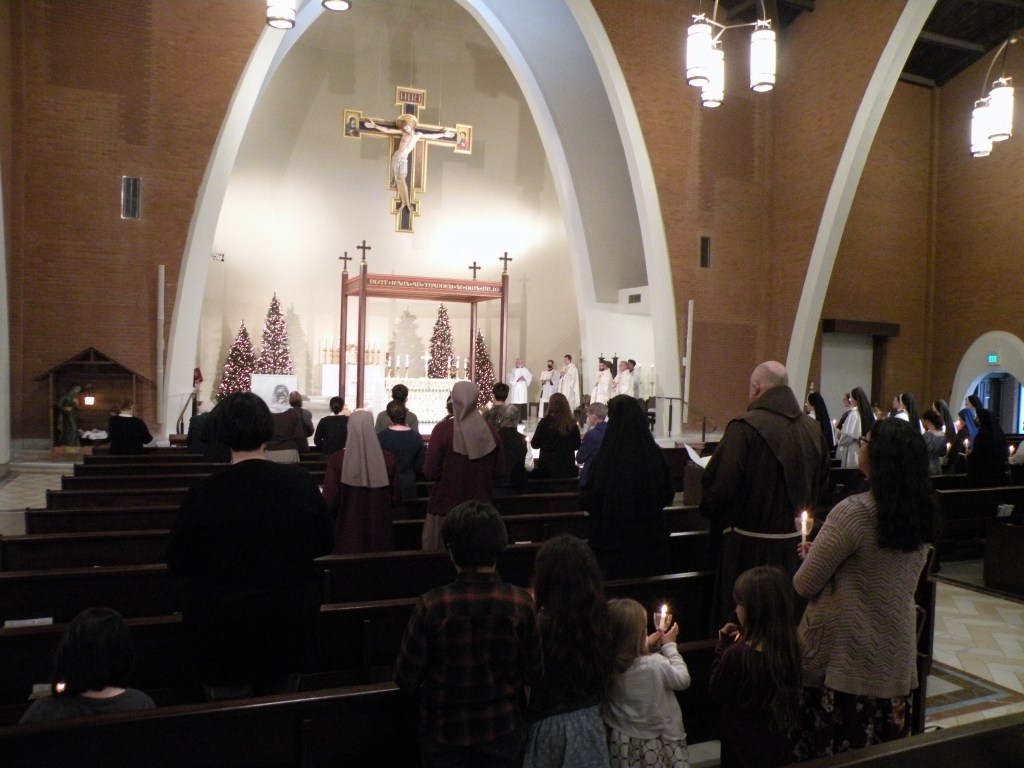 Father Eugene Mary of the Trinity blesses the candles before the candle lit procession for Mass.