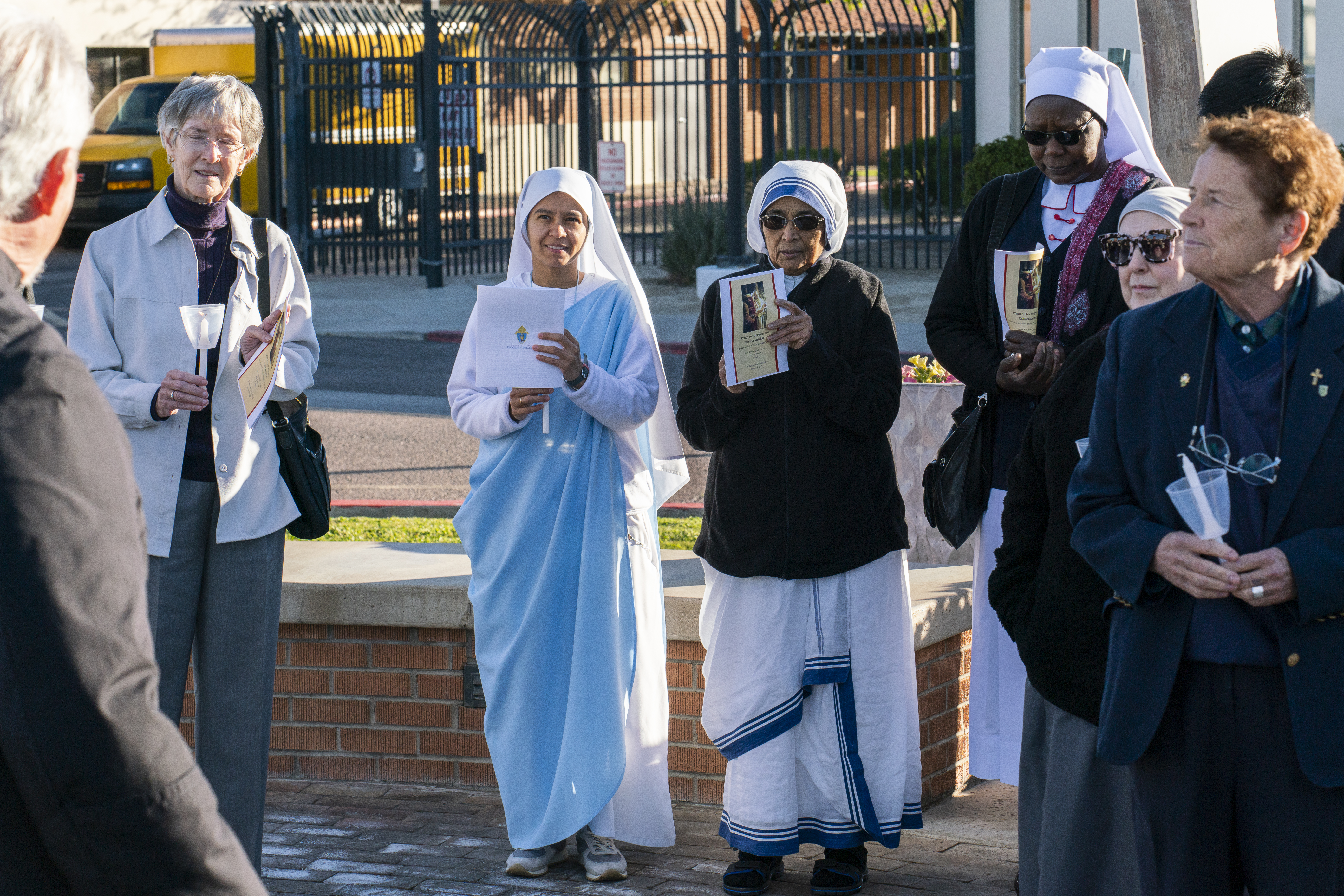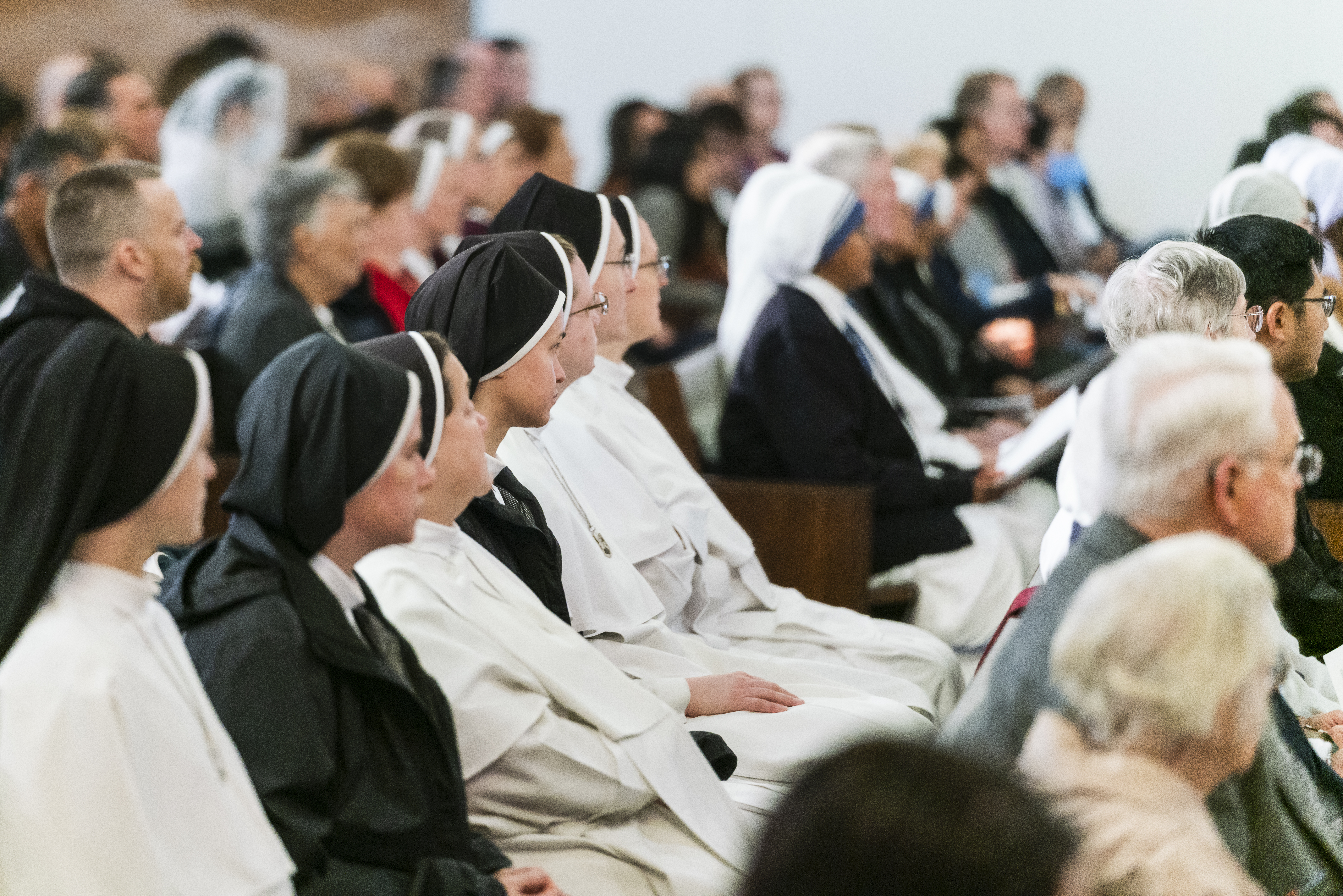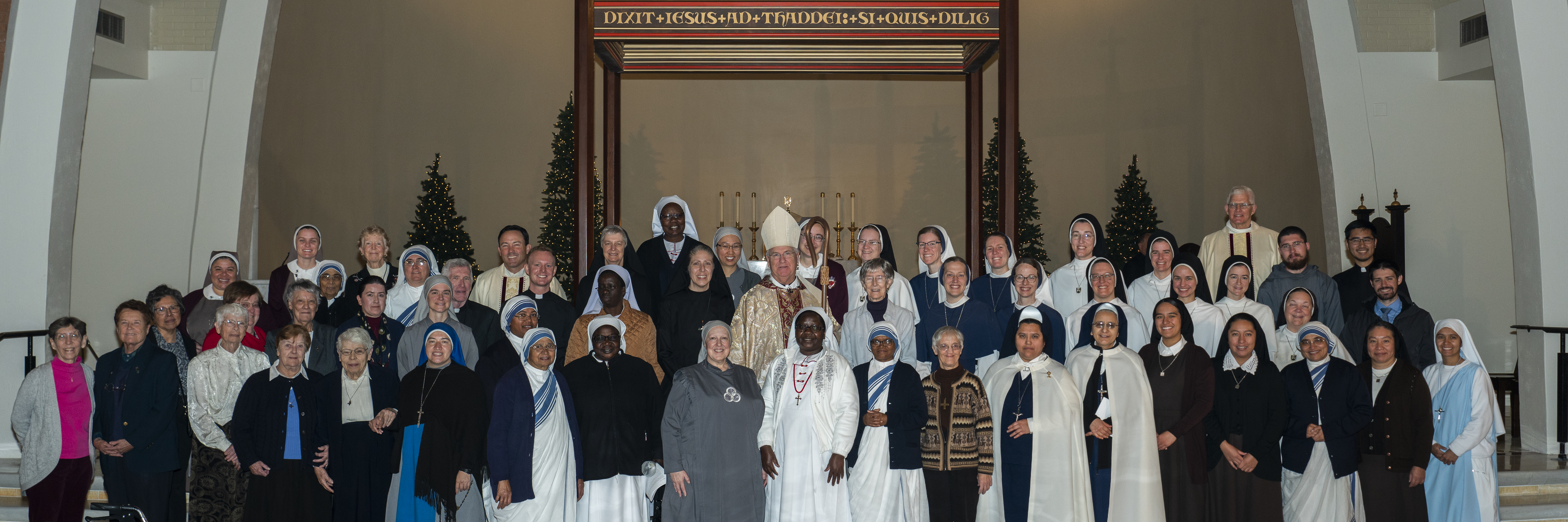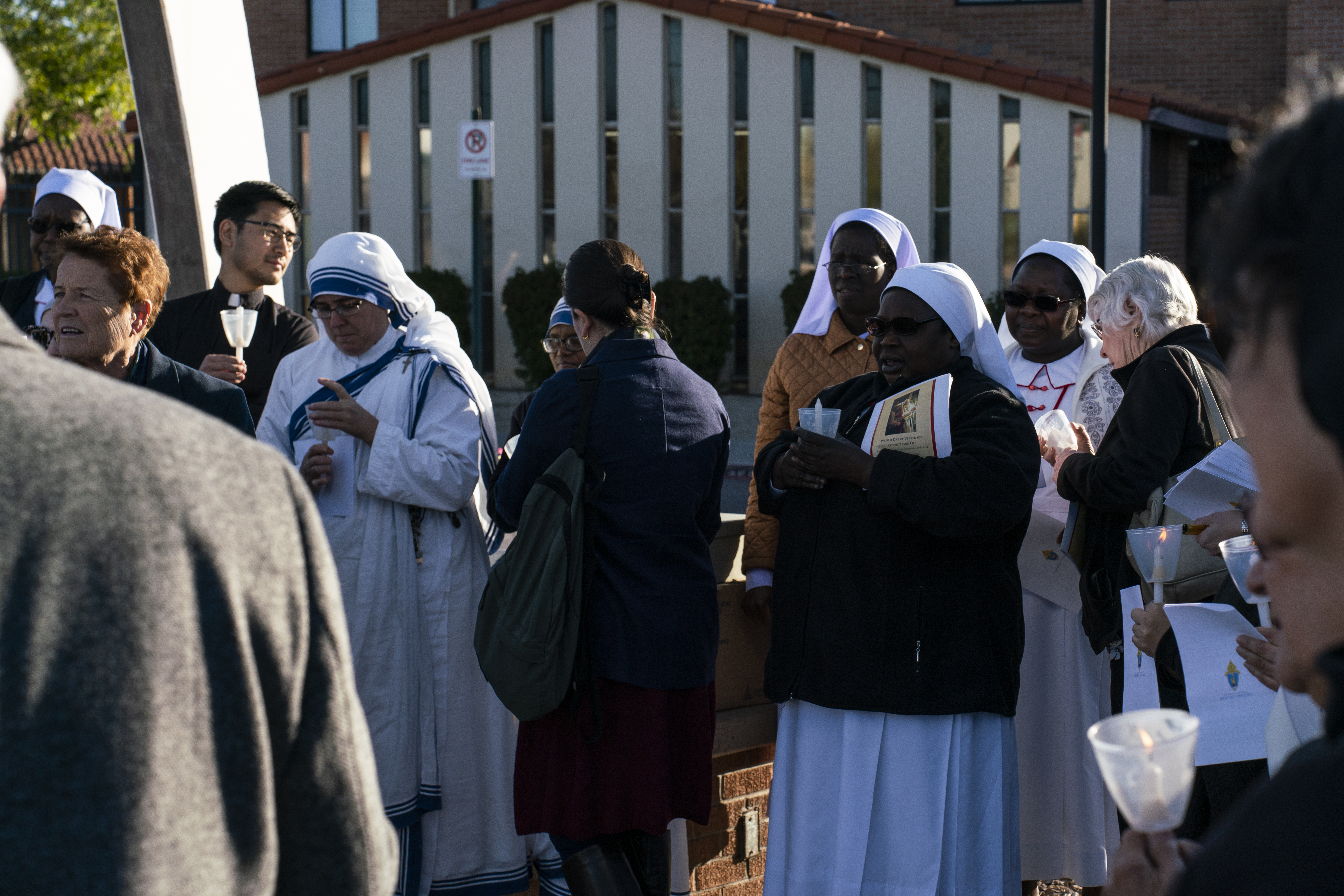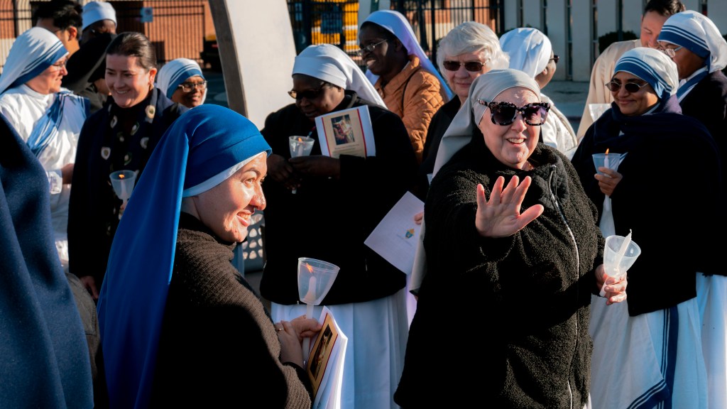 Religious Sisters of Mercy, Eucharistic Franciscan Missionary Sisters from LA, Sisters of Life, Servants of the Lord and the Virgin of Matara, Society of Our Lady of the Trinity, Missionaries of Charity, Servants of Mary and Bishop John P. Dolan in the back.